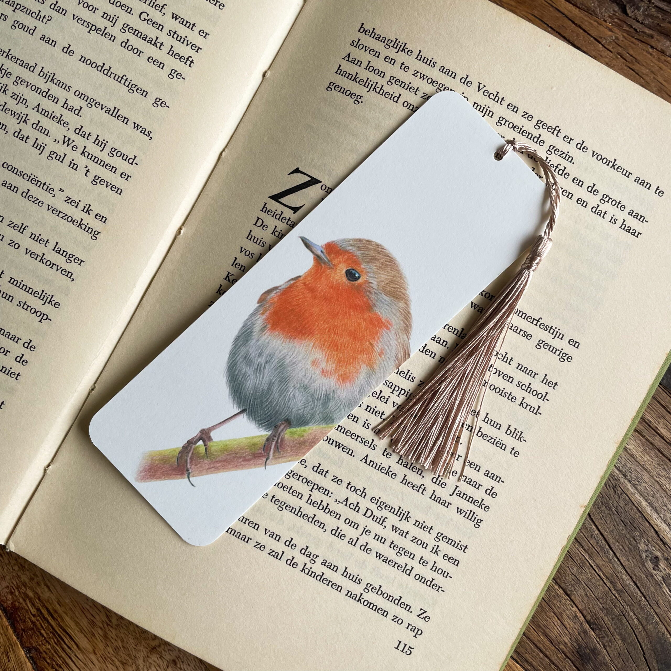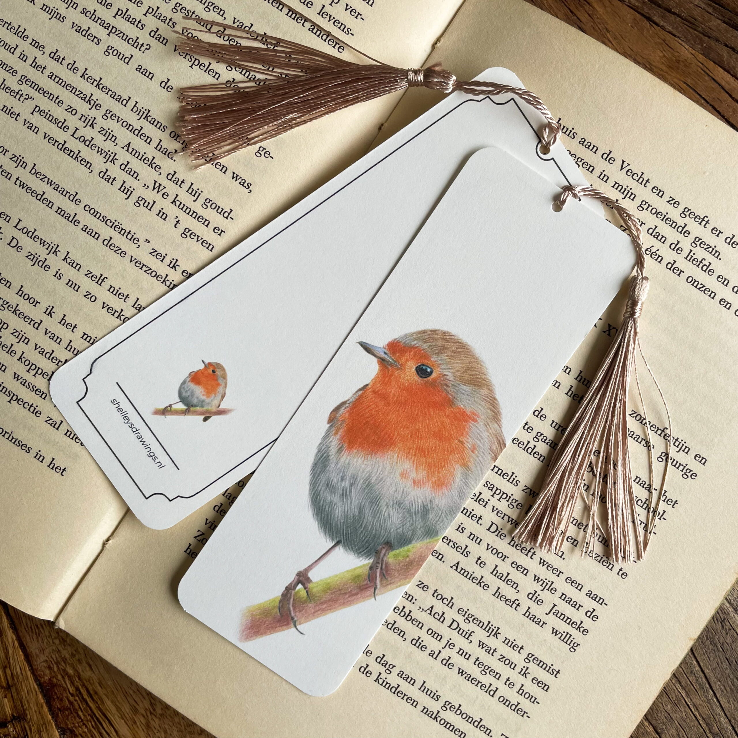 Handgemaakte boekenlegger met een kleurpotlood illustratie van een Roodborstje.