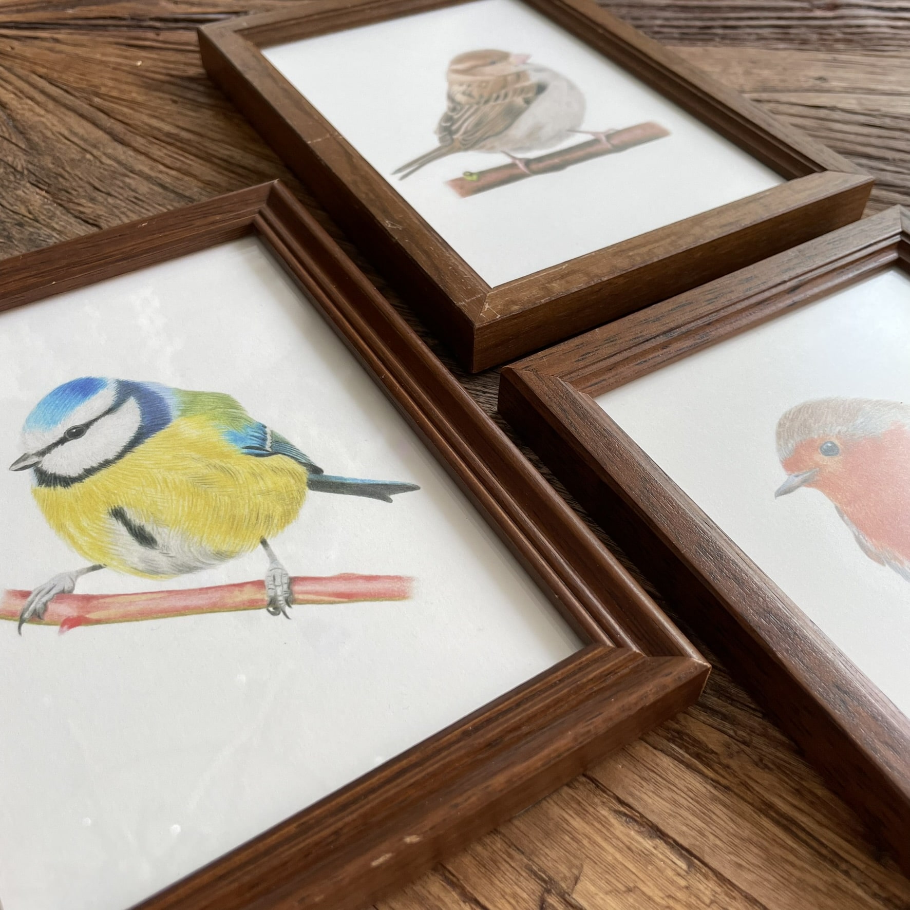 Ingelijste prints met tuinvogels, helemaal klaar om neer te zetten of op te hangen.